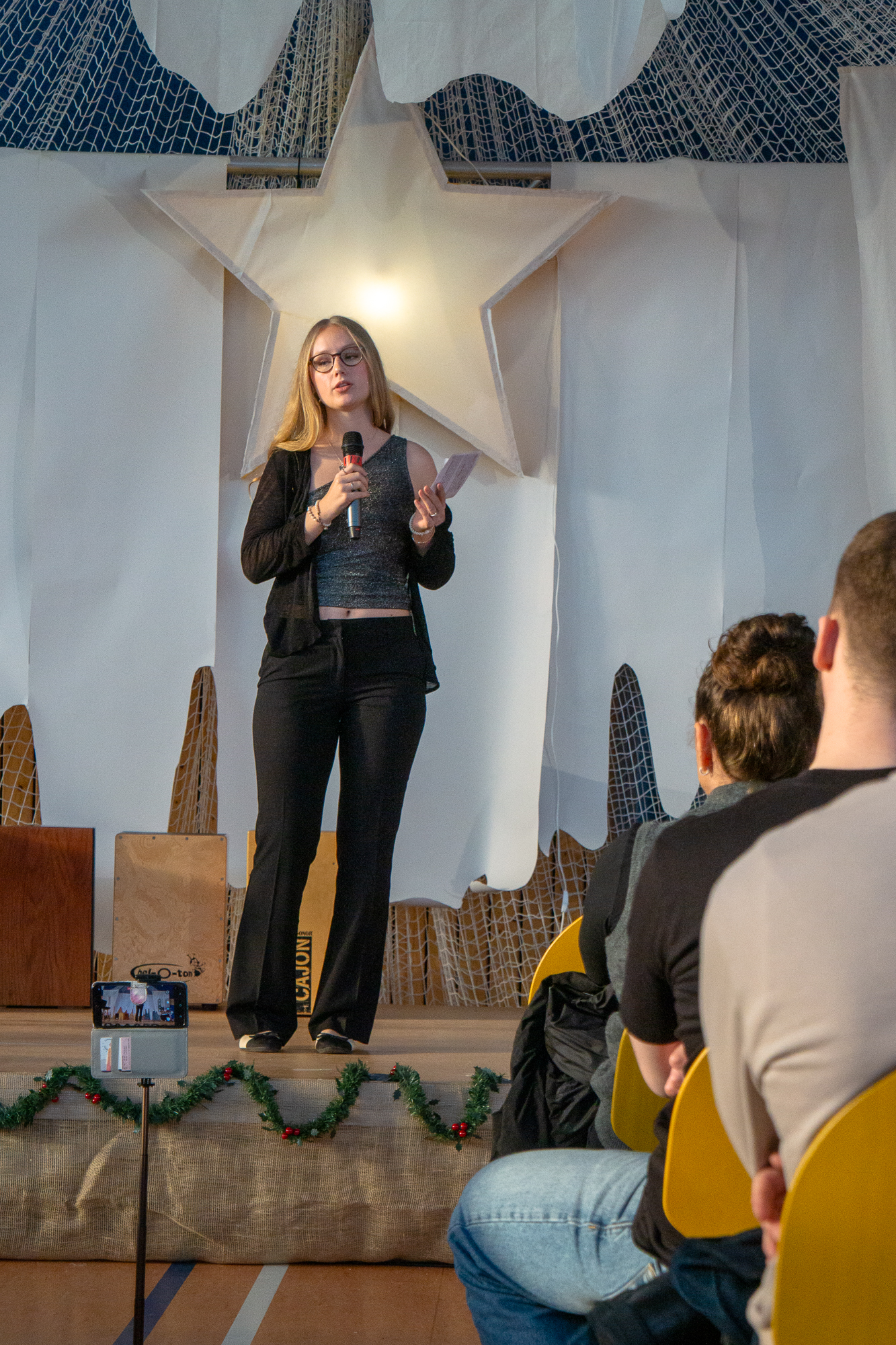 Unter dem Motto „Licht in´s Dunkle“ fand in diesem Jahr unser traditionelles Weihnachtsprogramm statt. Über 100 Schülerinnen und Schüler beteiligten sich an den Vorbereitungen: Sie gestalteten ein Bühnenbild, studierten Musikstücke ein, verfassten Texte, feilten an der technisch-medialen Umsetzung und entwickelten passend zum Thema ein abwechslungsreiches, 90-minütiges Programm, bei dem alle ihr Können eindrucksvoll unter Beweis stellen konnten.