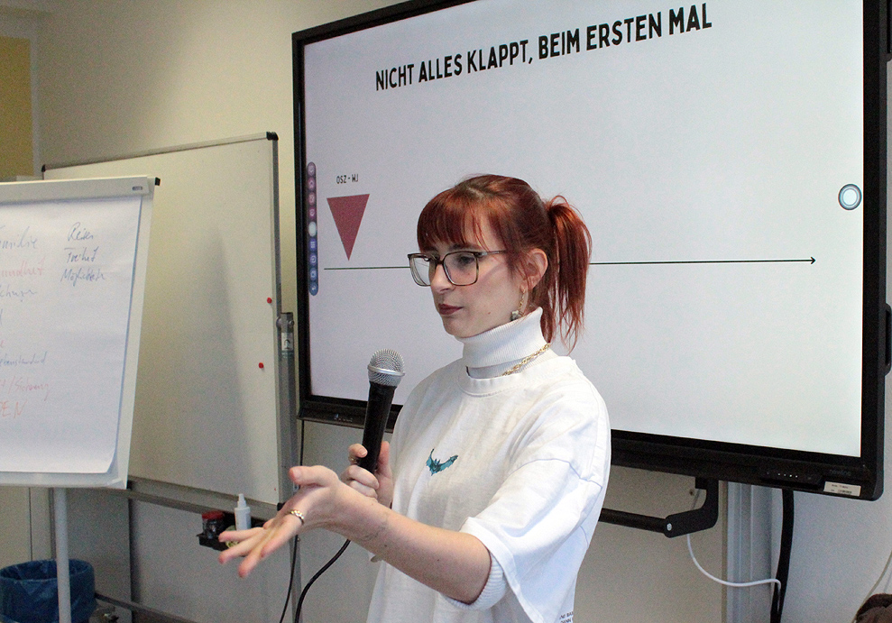 Im weiteren Verlauf berichtete sie von ihrem persönlichen Werdegang, vom GMOSZ, an dem sie selbst Schülerin war und im Jahr 2022 ihren Abschluss machte, bis hin zur Selbstständigkeit. Dabei sprach sie offen über ihre Herausforderungen, Rückschläge und Zweifel. Aussagen wie “Man darf auch mal fallen” oder “Nicht alles klappt beim ersten Mal” machten deutlich, dass Fehler ein natürlicher Teil des Lern- und Entwicklungsprozesses sind und nicht als endgültiges Scheitern verstanden werden sollten.